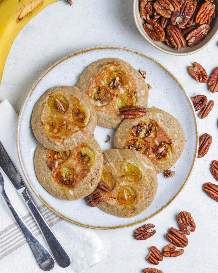 Esta receita é simplesmente divinal! Se és fã de banana, principalmente caramelizada, esta receita é para ti. Para além de ter um sabor incrível a banana e noz (não é obrigatório usar noz, mas extremamente recomendável a quem adora noz), são proteicas e sem açúcares adicionados. Vais experimentar?